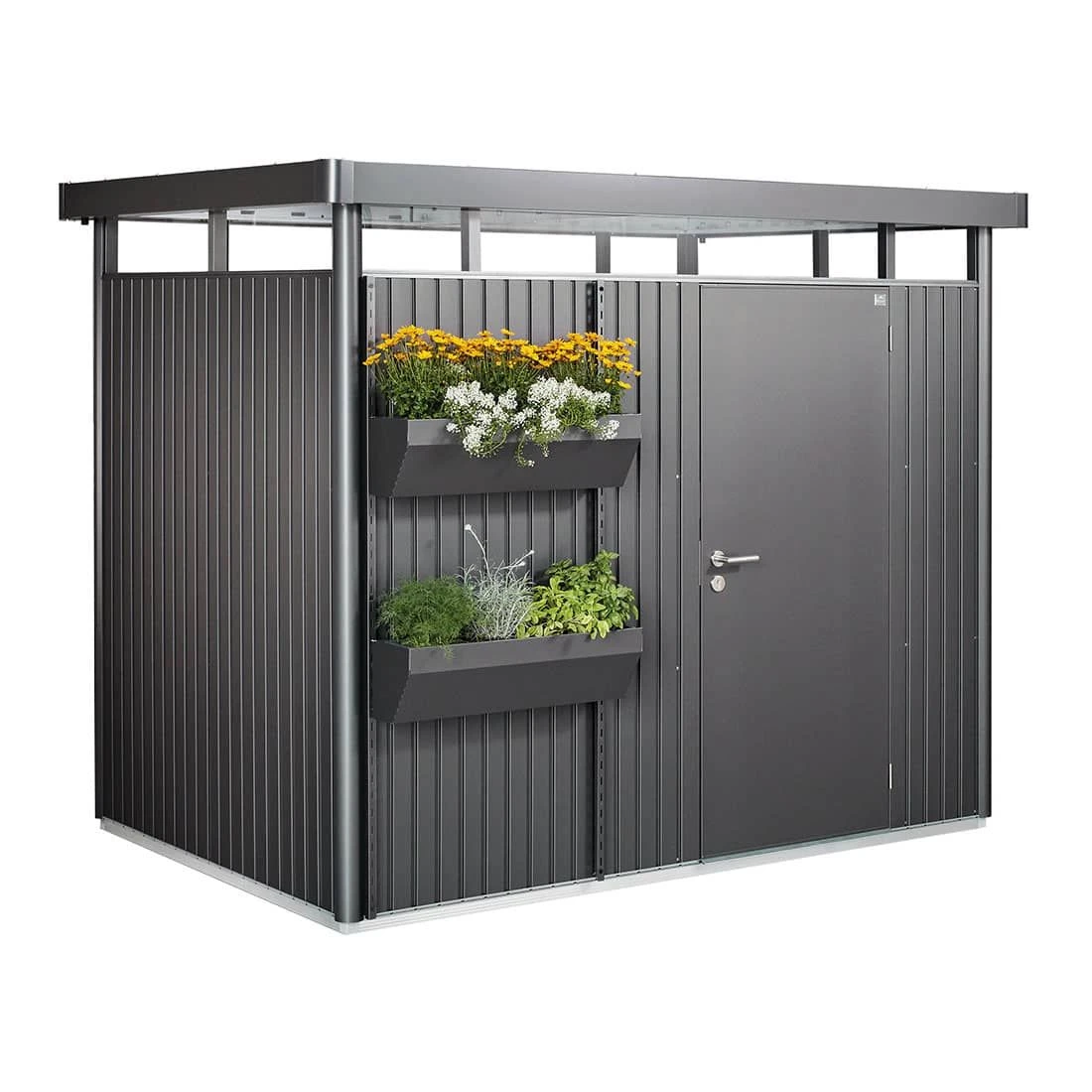 Bringen Sie Ihr Gartenhaus mit dem Biohort FloraBoard zum Blühen. Das Set besteht aus zwei Stehern in Dunkelgrau-Metallic, die an der Außenwand des Hauses angeschraubt werden. Dann können Sie die mitgelieferten Blumenkästen in beliebiger Höhe einhängen.