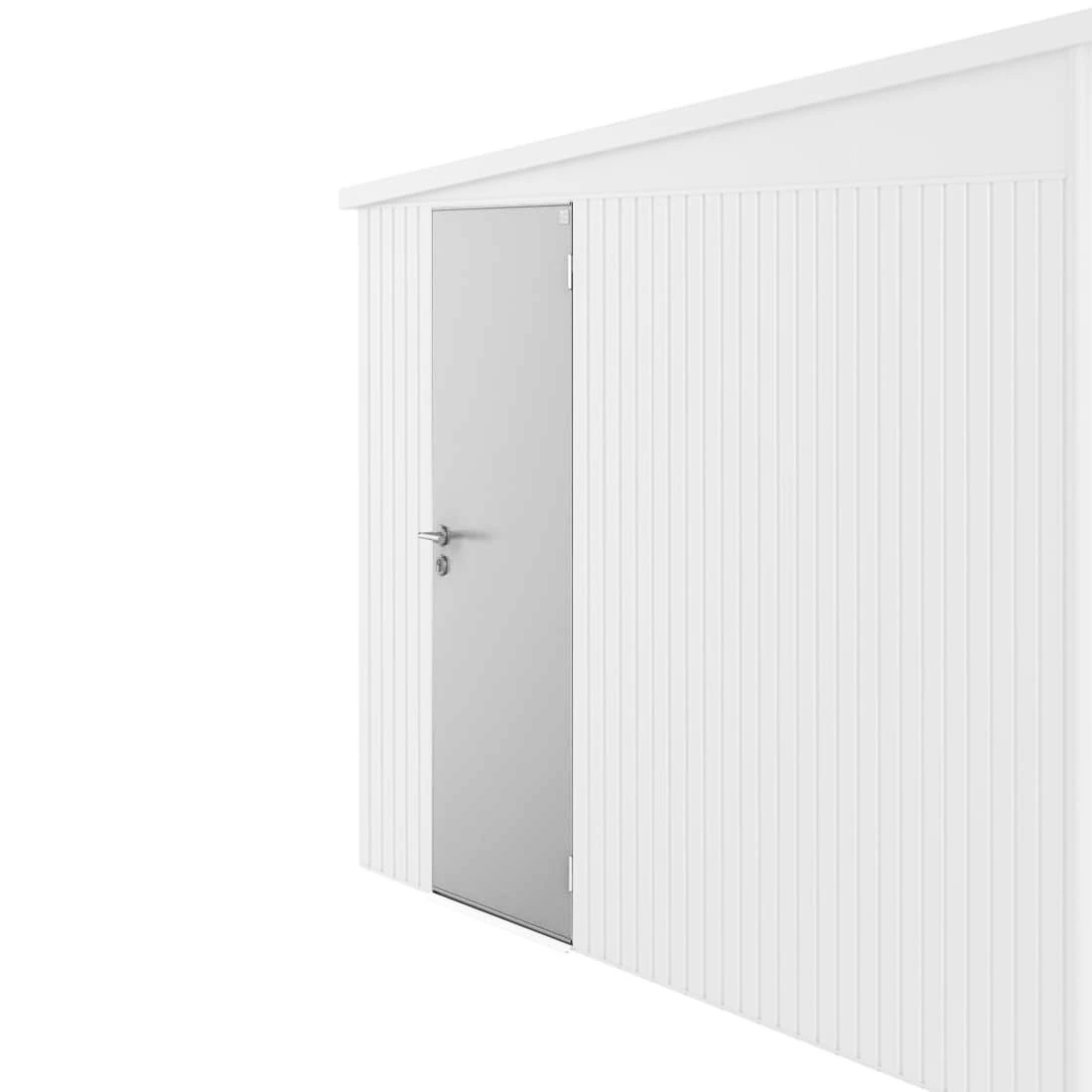 Damit Ihr Gerätehaus von zwei Seiten begehbar wird, können Sie die Biohort Zusatztür in Silber-Metallic (mit Edelstahl-Drückergarnitur) in einer Seitenwand einbauen. Im Lieferumfang der Zusatztür sind eine 3-fach Verriegelung, Gasdruckfeder, Scharniere, zwei Werkzeughalter sowie die passenden seitlichen Türanschlagbleche enthalten. Der Türanschlag ist nur rechts möglich.