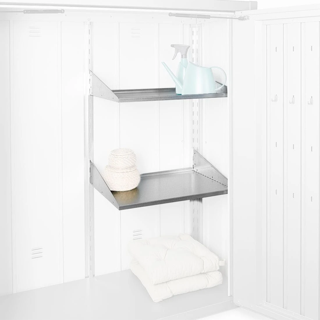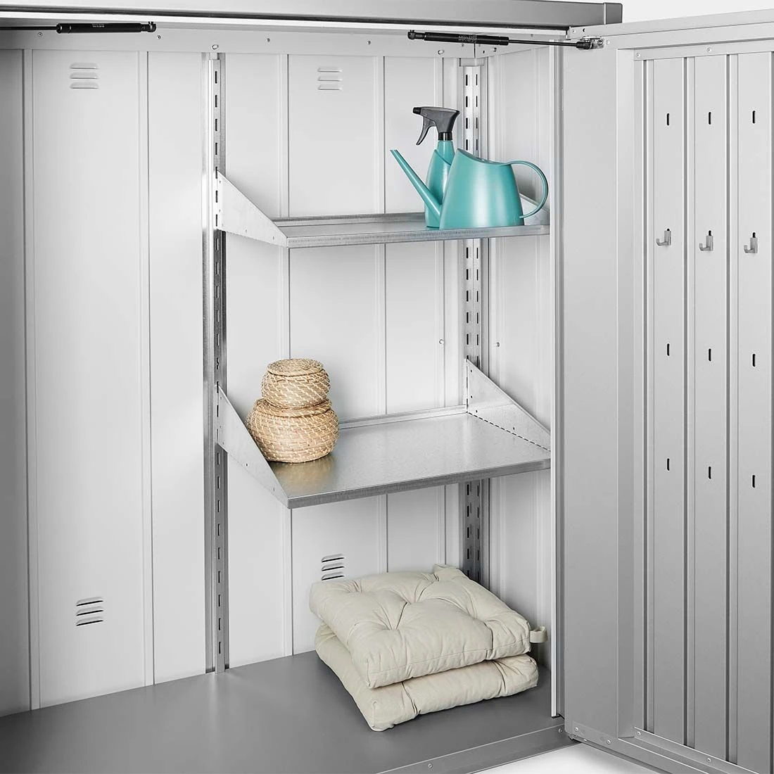 Das praktische Biohort Romeo Terrassenschrank Regale-Set besteht aus 2 feuerverzinkte Stahlböden (Länge ca. 61 cm). Die Böden dienen als Ergänzung zur Grundausstattung und können in die im Terrassenschrank vorhandenen Regalsteher eingehängt werden.