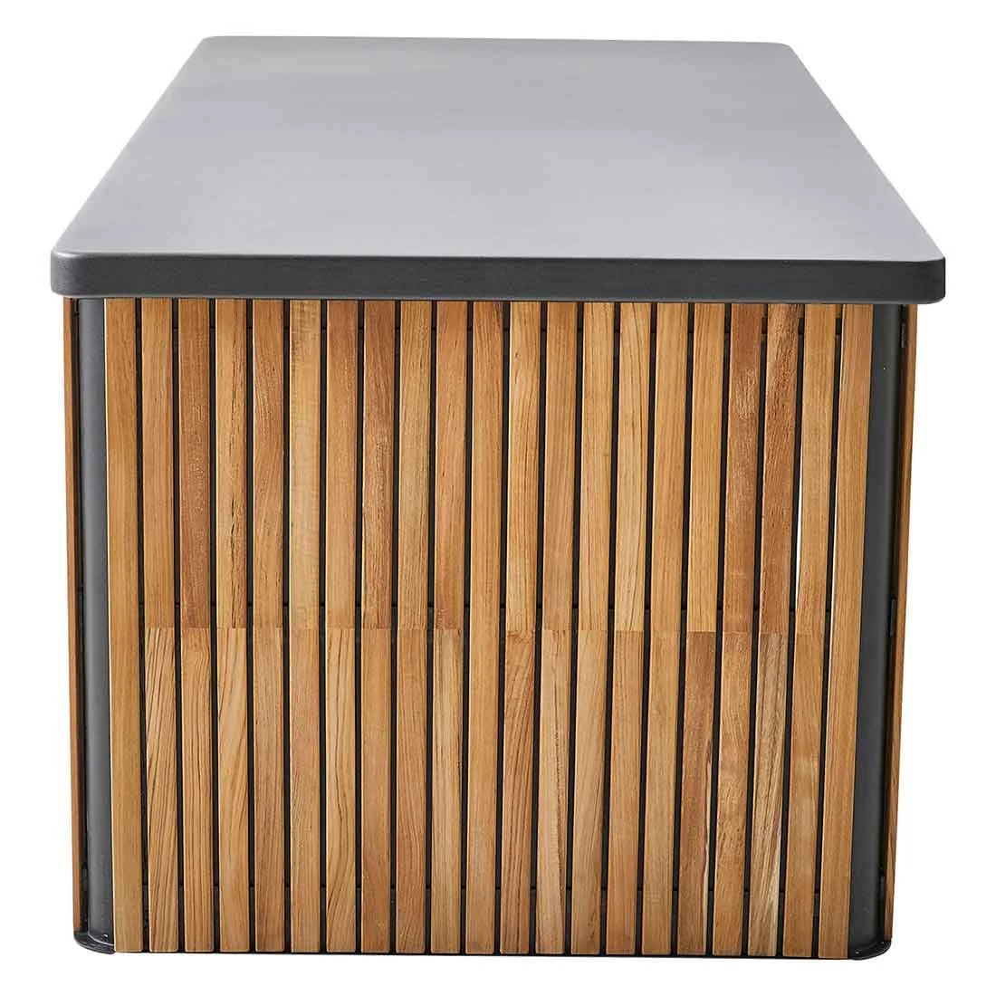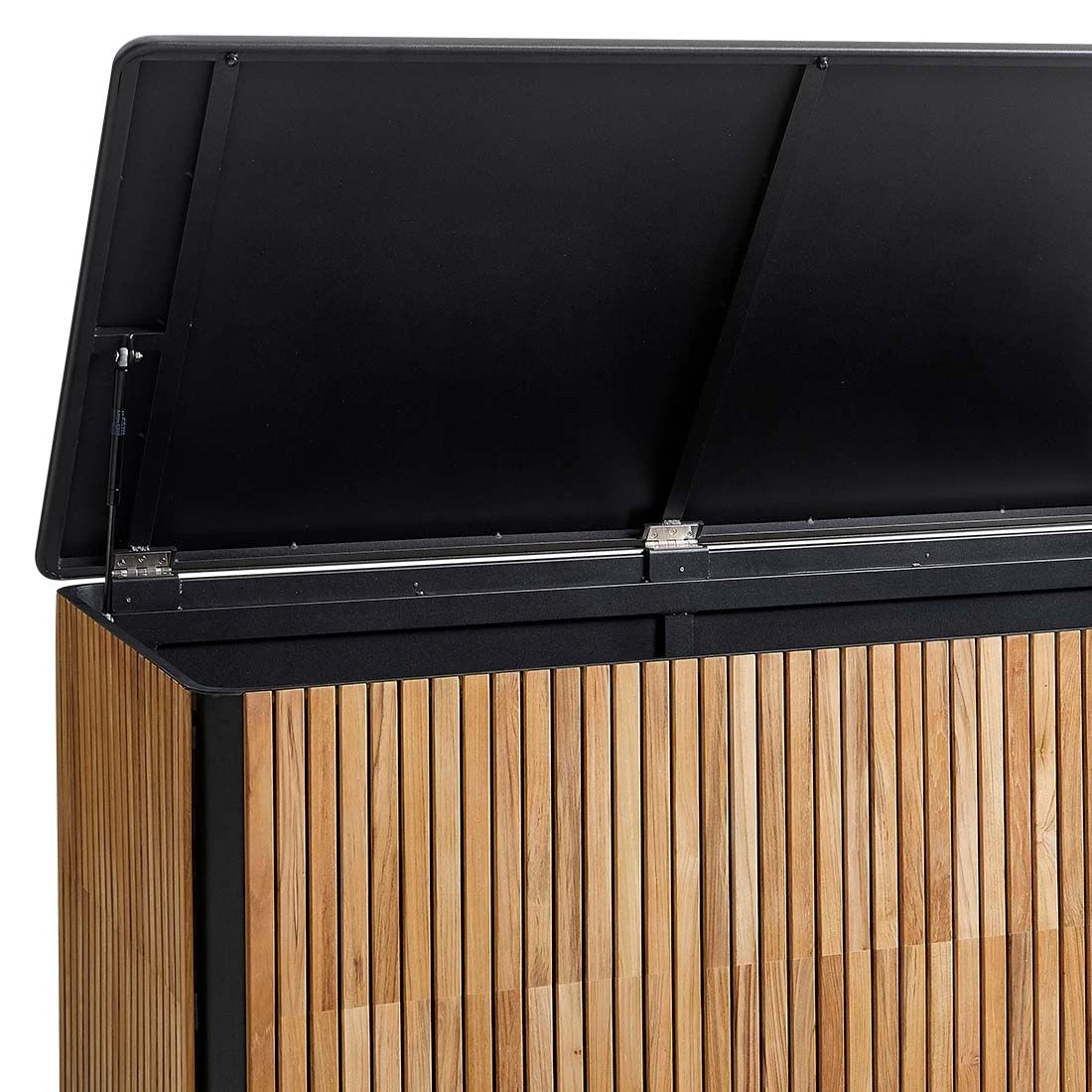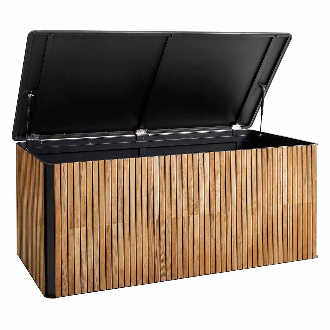 Der robuste Korpus der Gartenbox besteht aus natürlichem Teakholz. Der Korpus ist farblich in geschmackvollem Natur gestaltet. Gerade wenn es darum geht, die Gartenbox optimal zu integrieren, ist diese Farbe ideal dafür.