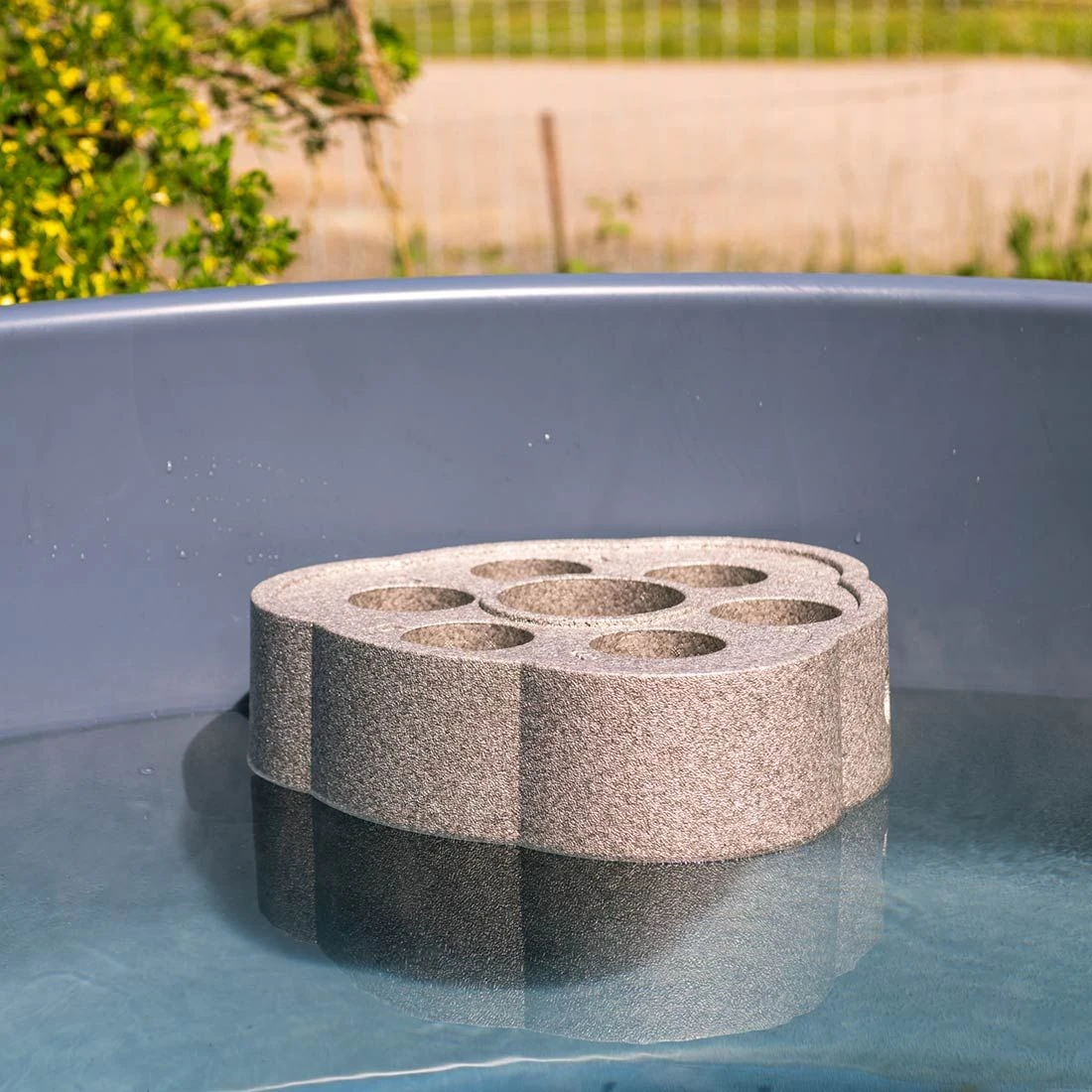 Als Außenofen kommt der grau gehaltene CULT-si zum Einsatz, der sich ideal zum Beheizen kleiner Badefässer eignet. Er wurde aus hochwertigem Meeresaluminium gefertigt, was eine äußerst gute Wärmeleitfähigkeit sicherstellt. Als Außenverkleidung dienen in einem schwarzen Kohlefarbton gebeizte Fichtenpaneele aus Finnland, deren schönes Erscheinungsbild lange erhalten bleibt. Die durchscheinende, hellgraue Innenwanne wird durch den leichten „Flöckchen-Effekt“ optisch zusätzlich aufgewertet. Die helle Farbe des Innenbeckens ist ebenso zeitlos wie trendy und fügt sich wunderbar in die Umgebung ein.