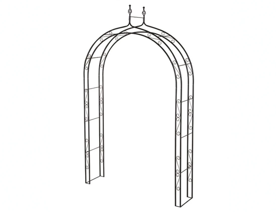Der verschnörkelte Rosenbogen besteht aus beschichtetem, grau lackiertem, Stahl.