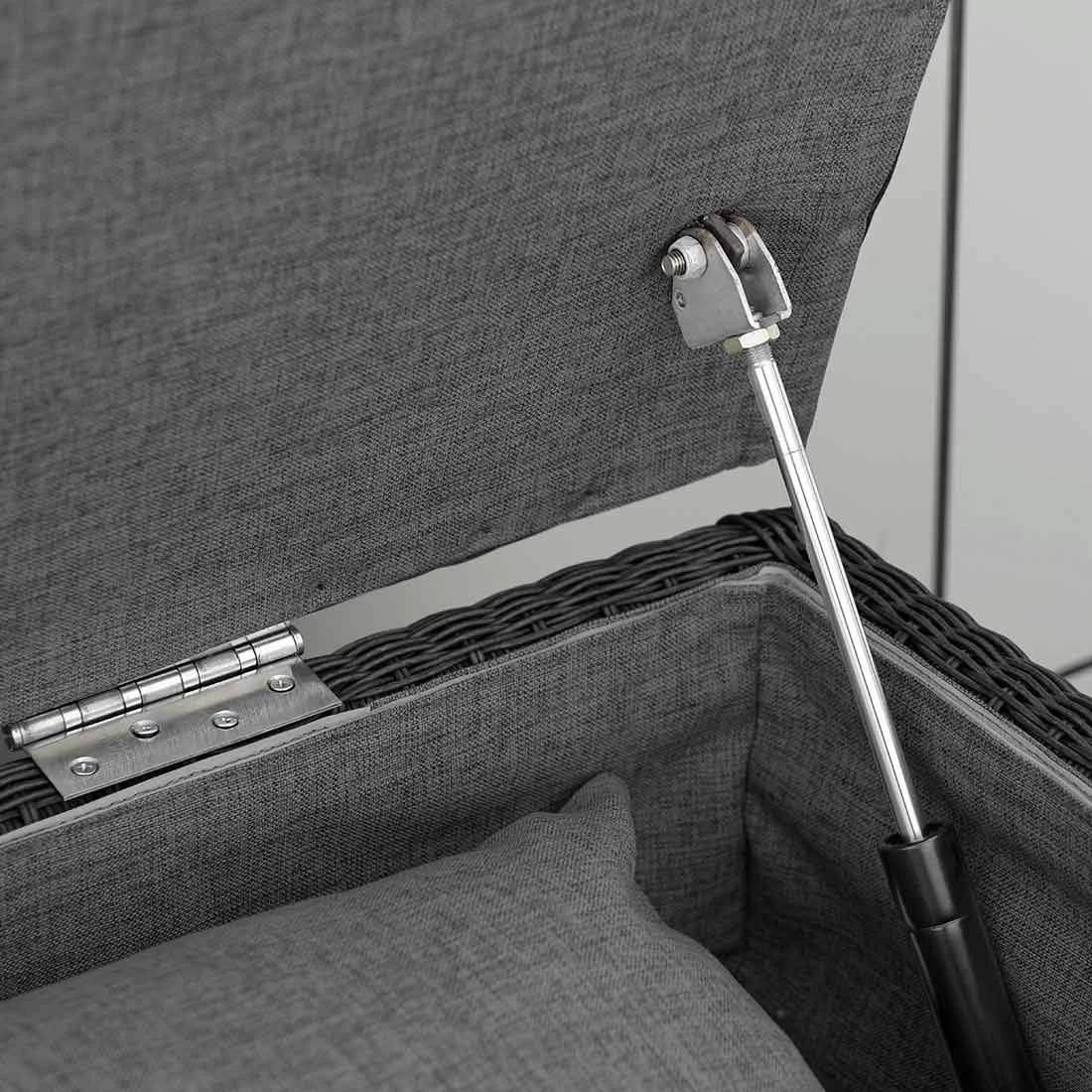 Das Gestell der Gartenbox ist aus Aluminium hergestellt. Der Korpus, der mit hochwertigem Polyrattan umflochten ist, bringt ein exklusives Flair auf Ihre Terrasse. Dieses Material zeichnet sich durch eine hohe Wetterbeständigkeit aus. Farblich ist die Gartenbox von Stern in ansprechendem Basaltgrau gehalten. Ideal, um in verschiedene Gestaltungskonzepte integriert werden zu können. Als hochwertiges Material für den Bezug kommt ein Polyester-Stoff zum Einsatz. Er ist sehr strapazierfähig und bietet somit die idealen Voraussetzungen für den Einsatz im Freien.